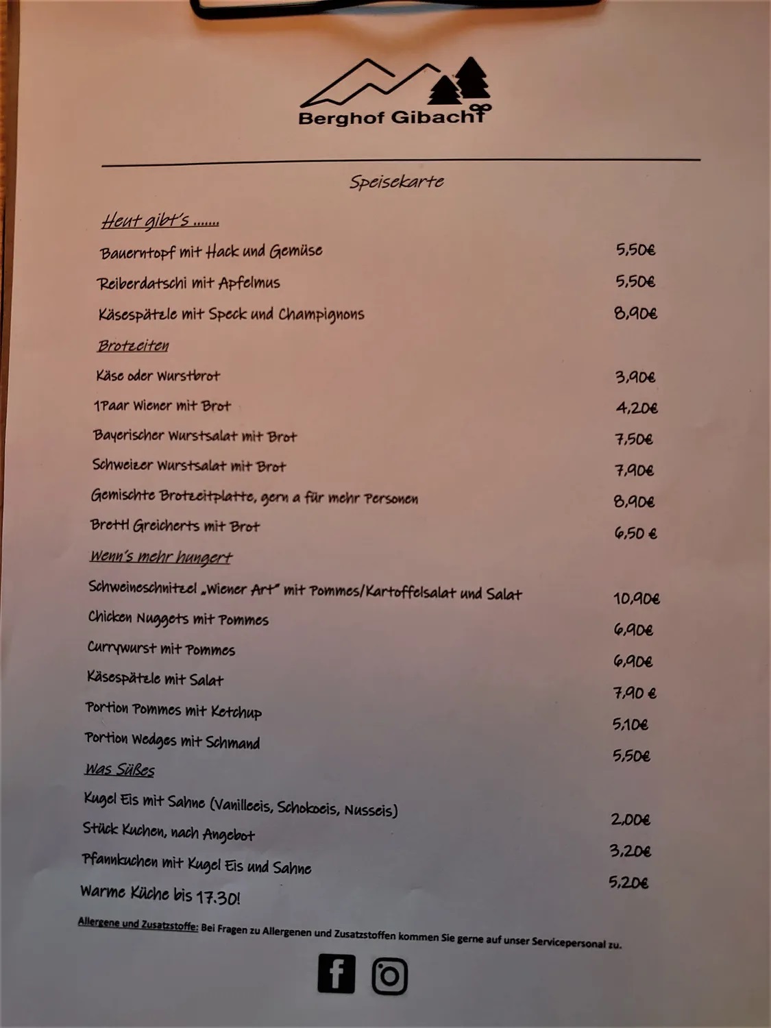Berghof Gibacht Speisekarte: