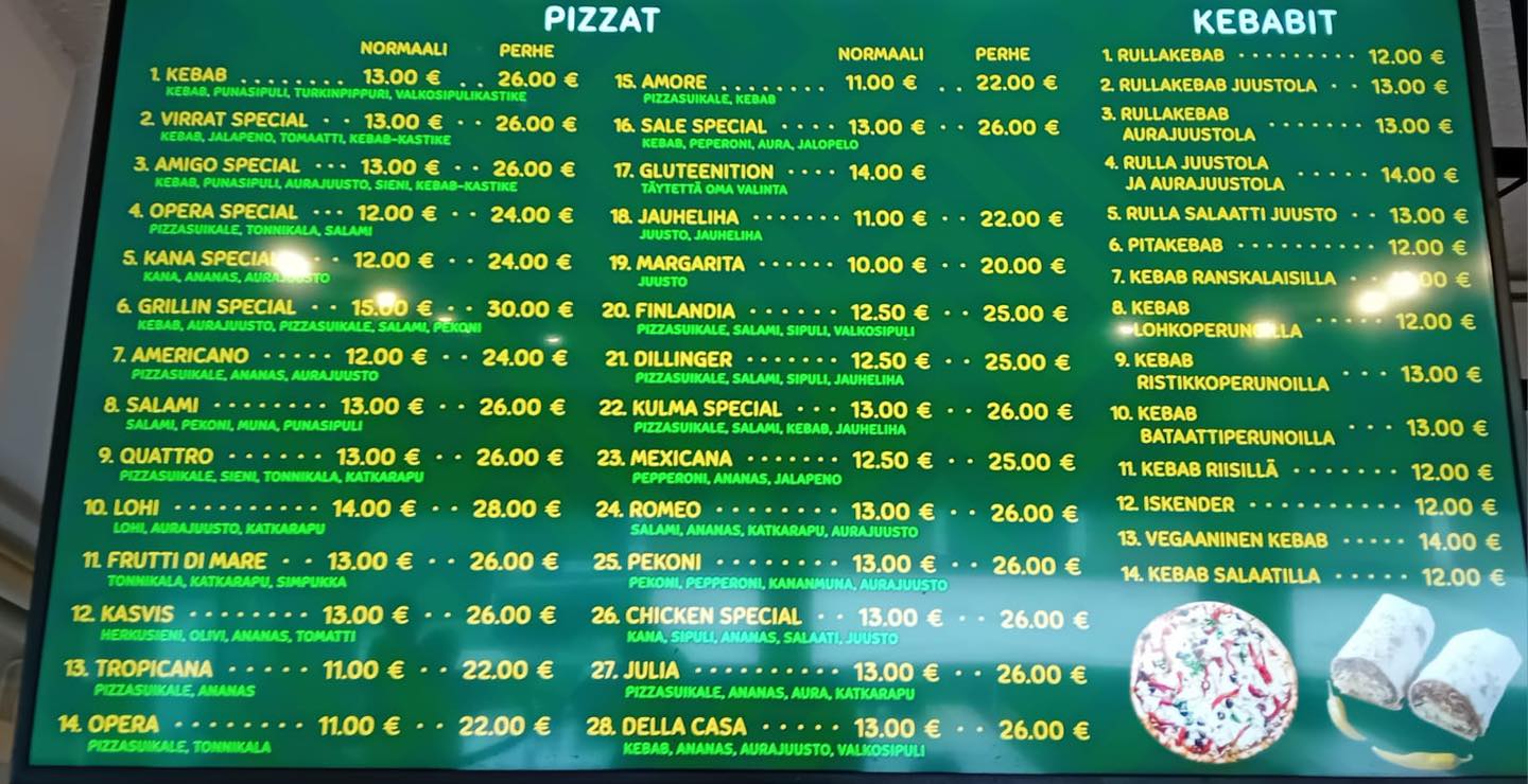 Kulmakahvila Virrat voit syödä kebab, pizza ja hintaluokka per henkilö: 9 €-24 €.