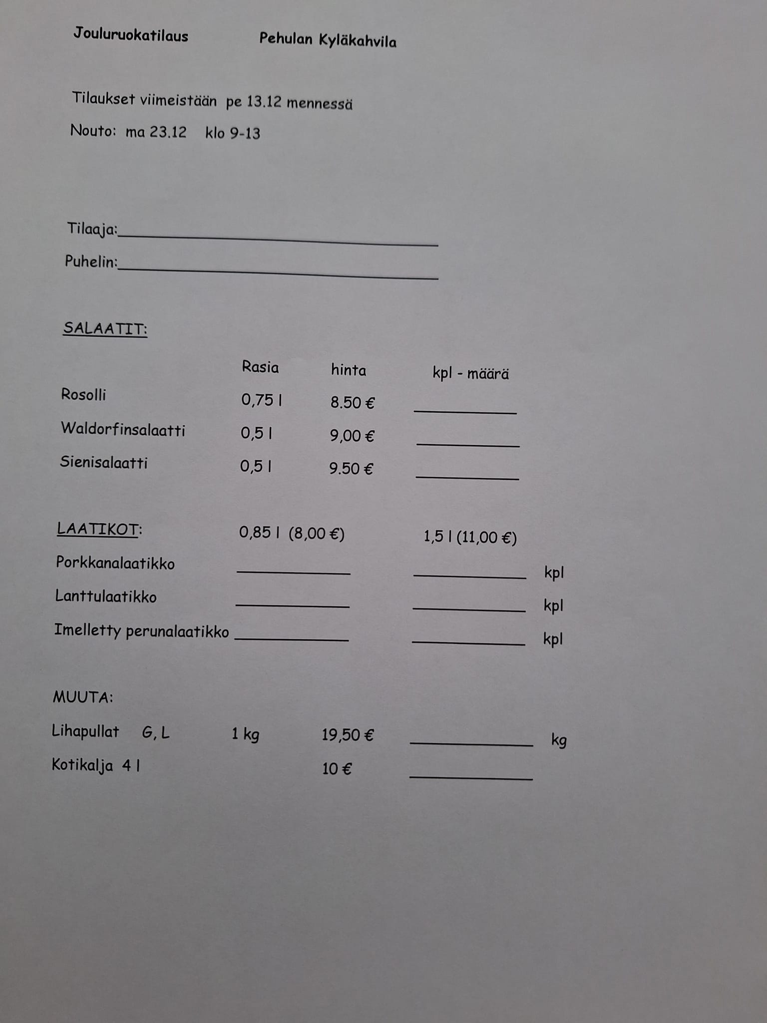 Pehulan Kyläkahvila menu: